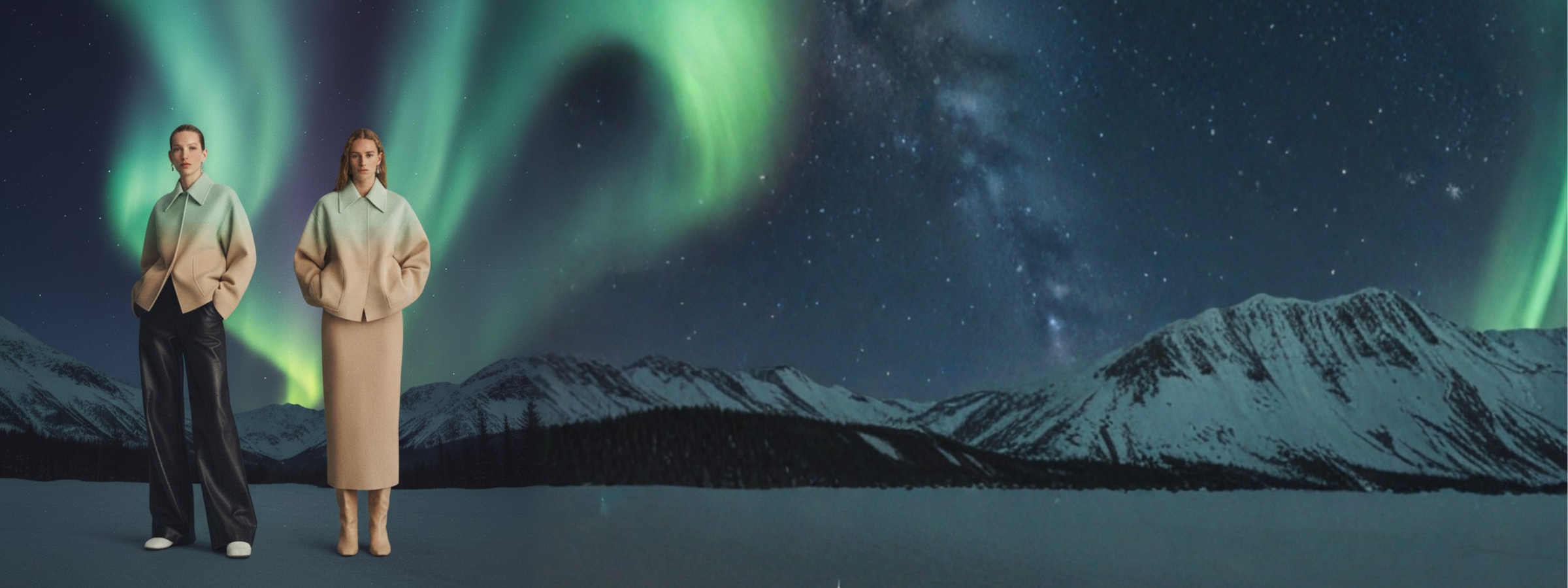 Fall 25 focuses on neutrals with pops of color and texture, including velvet as an everyday fabric. Winter 25 plays with volume and geometric shapes, using printed and metallic fabrics to evoke the majesty of an evergreen forest and mesmerizing flashes of light on ice.