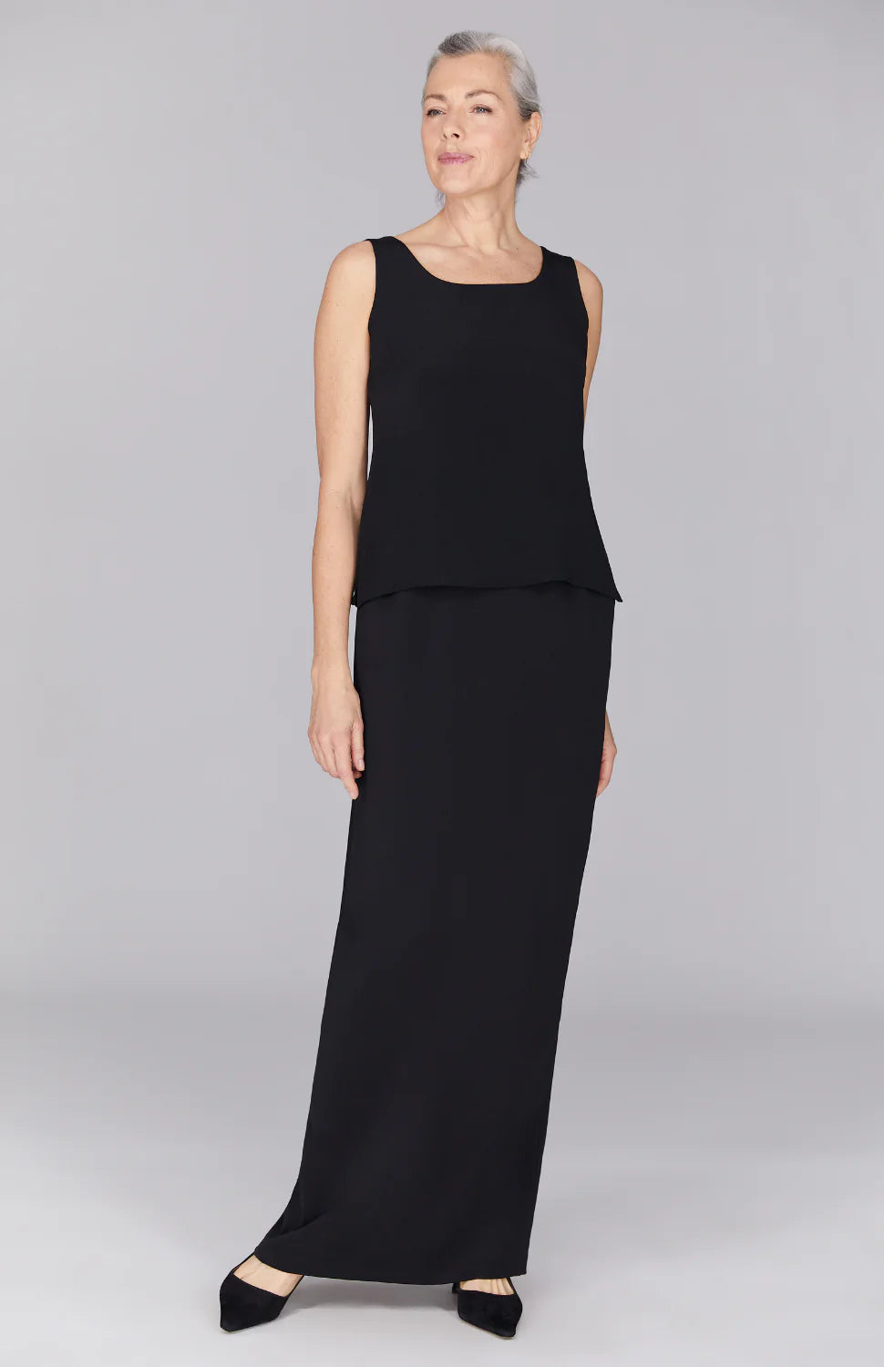 Our third skirt category, the maxi, is the rarest. Full-length, it can be straight and tailored, as shown above, or fluid and fuller. Gorgeous and delightful to wear sometimes, they obviate the need for hosiery and are more versatile than gowns. Overall, however, they work best for formal affairs, social occasions, or lounging. Having to hike a maxi up to cross 7th Avenue and navigate Subway stairs, or even to get in and out of your car, takes the grace and half the fun out of wearing them day to day.