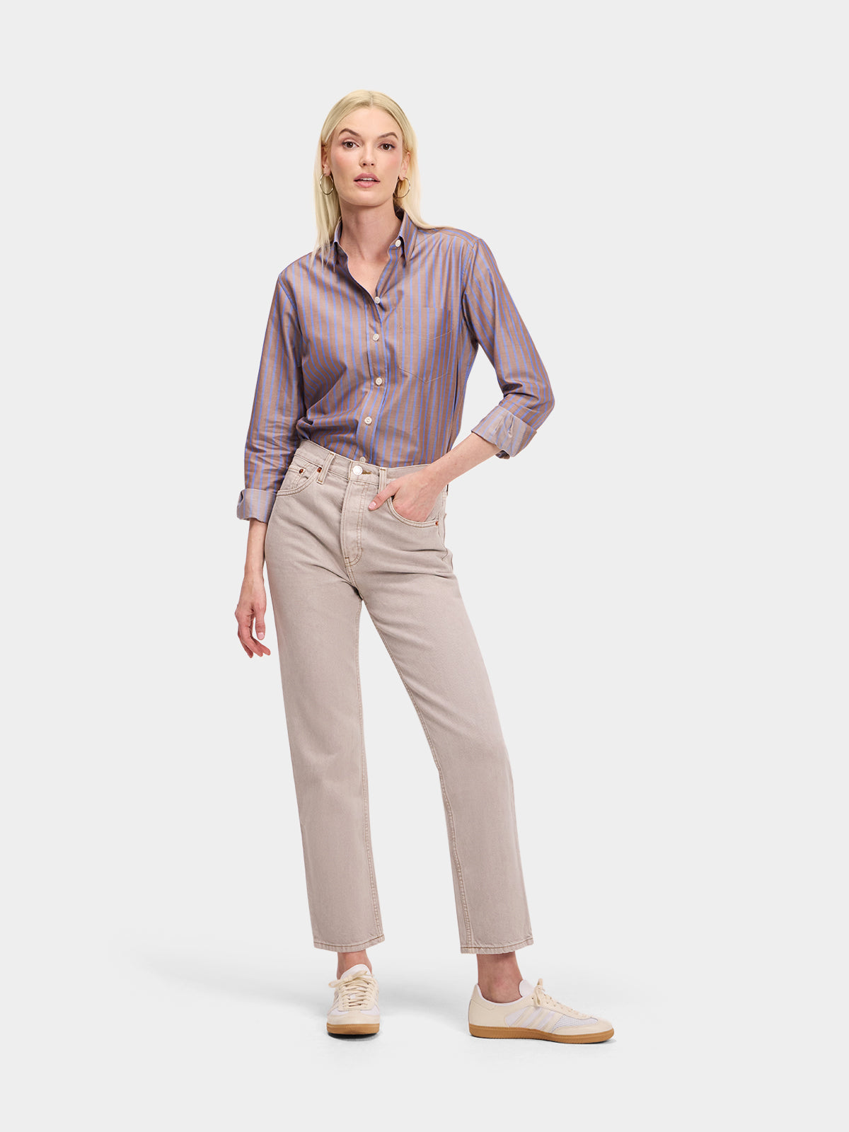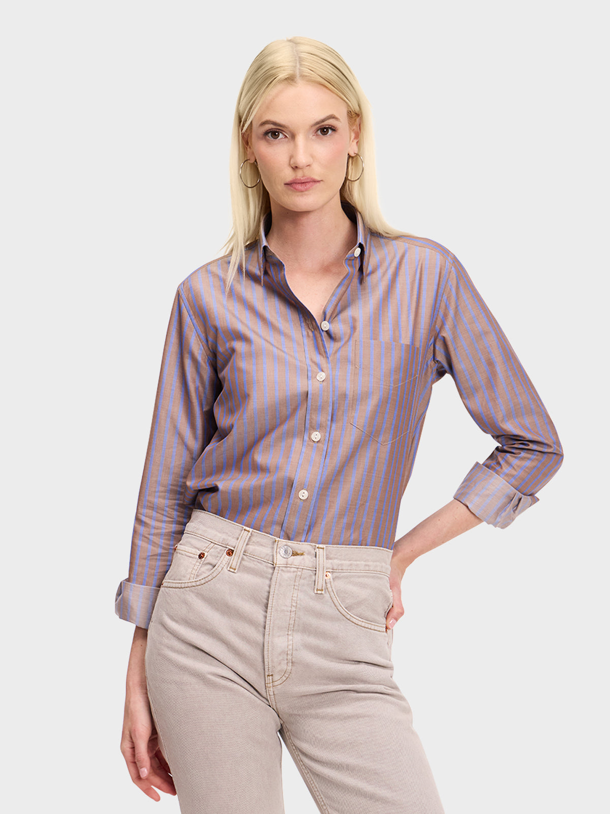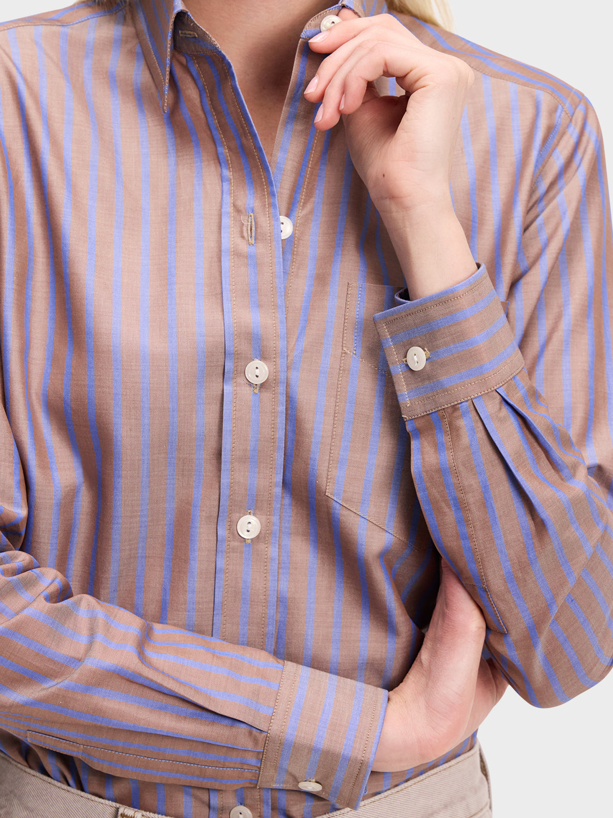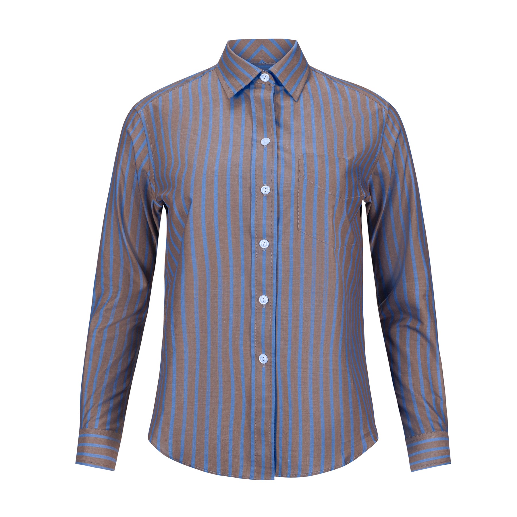 Our menswear inspired Weekend Shirt in a classic brown and blue stripe.