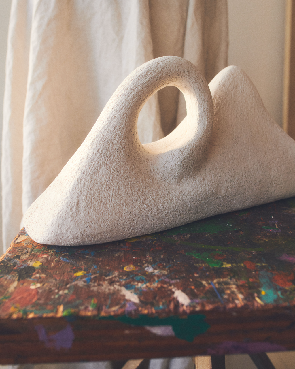 Pottery vessel shapes, textures, colors, and glazes are instantiated in garment silhouettes, unique prints, sculptural folds, and colors. – some bold, others soft and layered.