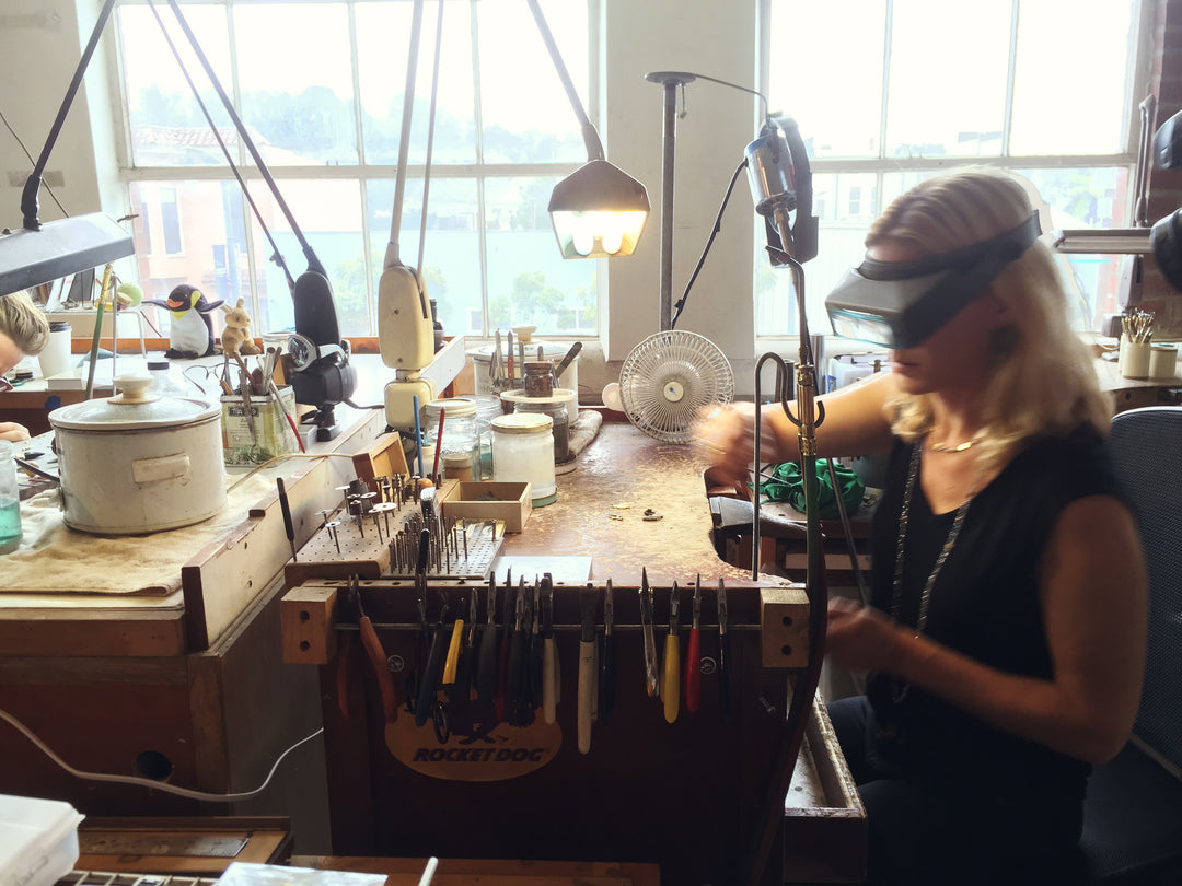 Kit turned 25 in January, and when time finally allowed in April, we hiked an hour from home along the Rio Grande Trail to Sarah's studio and settled gratefully with a glass of wine, surrounded by tools, books, and a few cases of Sarah's pieces. Listening to Kit and Sarah chat made me miss the dressing room conversations and marking life's occasions with a special item or two.