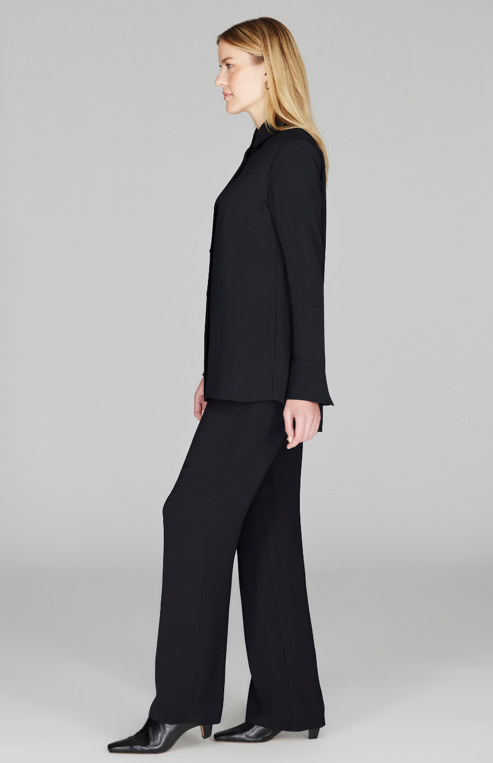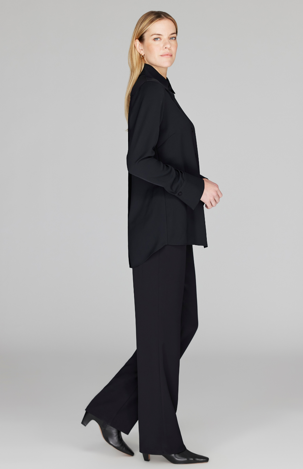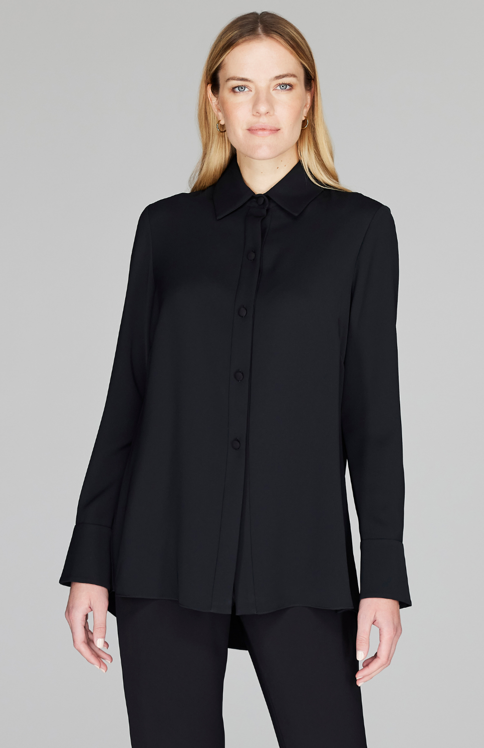 Our best-selling collared button down shirt, featuring a back overlap for beautiful movement and comfort. Try out a classic Pearl or Black or use this blouse to add a fun pop of color.