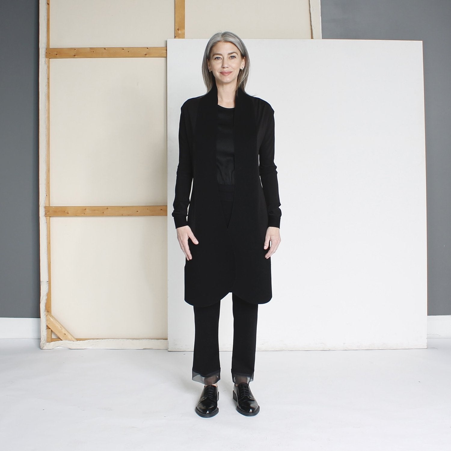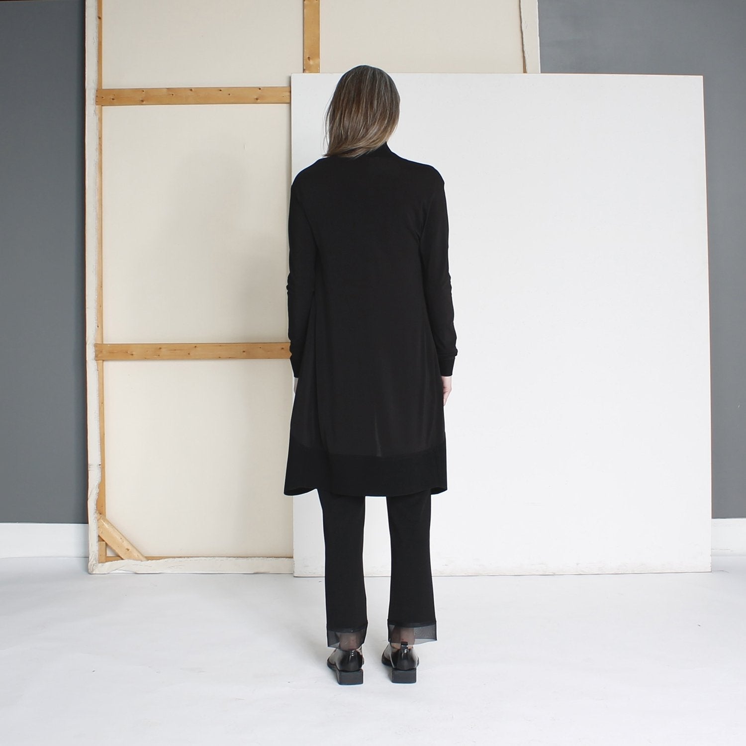 The KUTA2 Jacket features a refined frock cut crafted from smooth acetate jersey, offering both elegance and comfort. Its structured double techno-jersey shawl collar adds a modern architectural touch, while the rounded hem enhances its sophisticated silhouette. Perfect for elevating any ensemble with understated luxury.