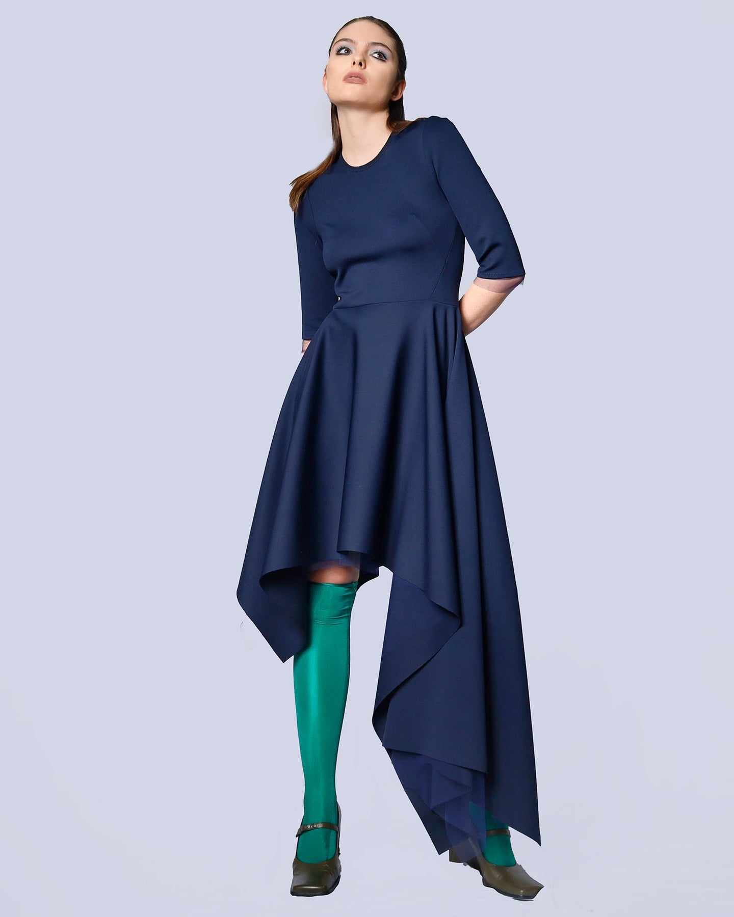 The MARA dress plays with movement, layering, and asymmetry to dramatic effect. Crafted in Fine Scuba and softened with tulle inserts, it drapes fluidly with cascading fabric that create a subtle side train. Whether worn on its own or styled over pants, it delivers elegance with an edge — made to stand out.