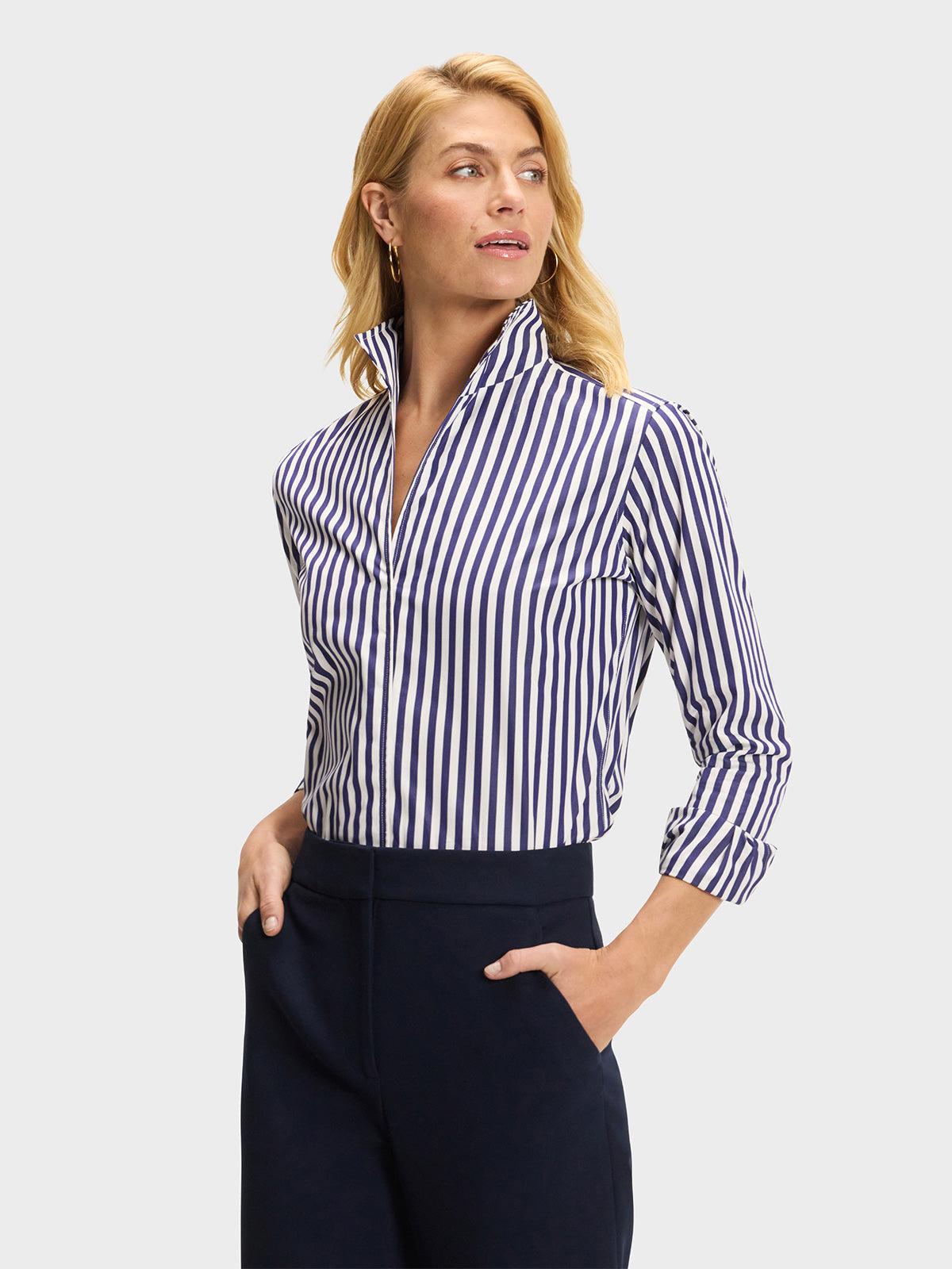 Our best-selling Signature Shirt in a navy blue and white stripe.